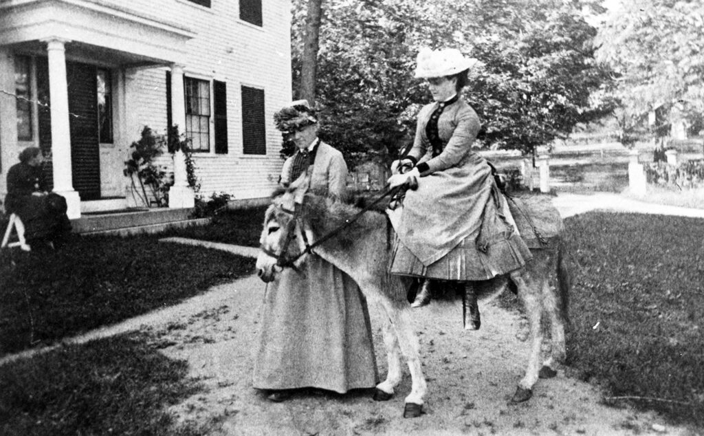 Ellen Emerson leads Edith Emerson on Gloriosa, Ellen’s donkey, c. 1870s